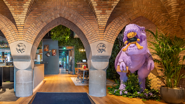 Jede fünfte Kirche in den Niederlanden wurde schon umgewandelt. Die bunte, comichafte Inneneinrichtung von »Bunk« versteckt dessen Vergangenheit als »St. Rita Kirche« nicht, sondern spielt mit dem Kontrast: Neben alten Torbögen steht etwa ein großer lila Dinosaurier. Man kann im »Bunk« nicht nur in Hotelzimmern schlafen, sondern auch in »Pods«, futuristisch aussehenden, übereinander gebauten Schlafkabinen, die nur ein Vorhang verschließt. Das spart Geld und zahlt ein auf den liberalen Geist der Stadt.