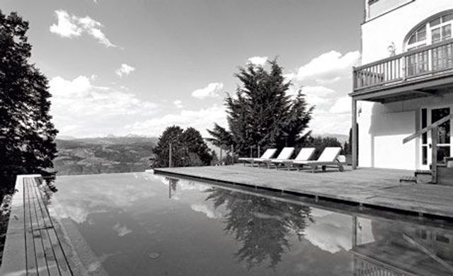 Als wir im »Gasthof Kohlern« auf 1130 Metern ankommen – etwas verspätet wegen einer Autopanne –, erholt sich am Pool der Rest einer Hochzeitsgesellschaft; Braut und Bräutigam dösen im Schatten, ein paar Kinder streifen umher, der Trauzeuge schlurft Getränke holen. Der Pool selbst aber ist frei, und der Blick daraus ist unglaublich, unendlich, man glaubt fast ins Tal hinauszuschwimmen.