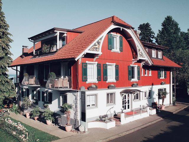 Schreck beim Öffnen der Wetter-App: Am Wochenende wird es durchregnen. Gegen die Aussicht, alles zu verpassen, was man bei schönem Wetter am Bodensee unternehmen könnte, hilft es, eine Unterkunft zu haben, in der man es auch drinnen gut aushält. Das »Haus am See« war mal eine Schreinerei, die Zimmer sind gemütlich, Seeblick hat man auch von innen fast überall. Beim Frühstück erzählt mir der Seniorchef von seiner Schwimmroutine (eigentlich jeden Morgen, aber heute regnet es selbst ihm zu stark). Am Nachmittag sehe ich vom Ruheraum des Spas aus, wie die Bodenseefarbe unter den finsteren Wolken von Türkis nach Dunkelgrau changiert. Beim Abendessen freue ich mich über das kurze Abendrot, das den Gipfel des Schweizer Bergs Säntis am anderen Seeufer beleuchtet.