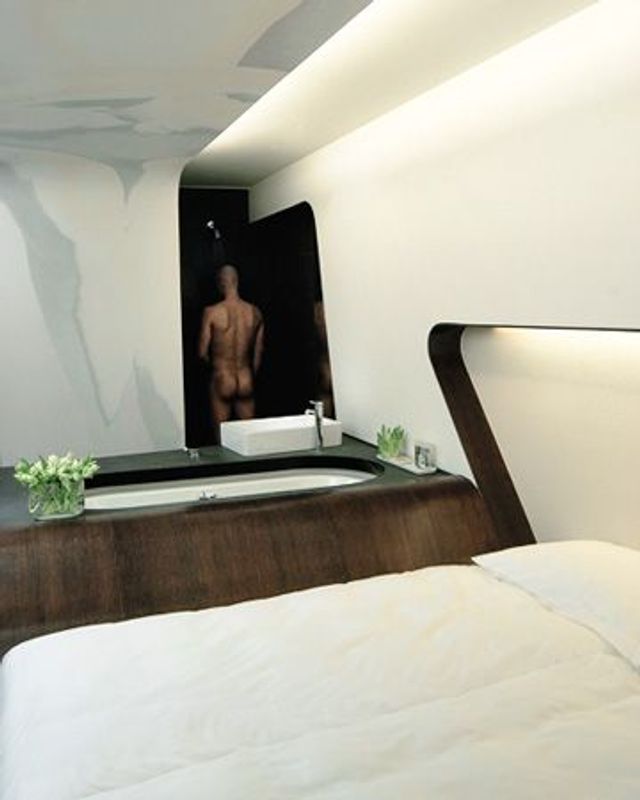 Das Hotel selbst hat eine Vielzahl von Designpreisen bekommen. Nun ist das mit dem Design ja so eine Sache: Oft schaut man interessiert bis zugeneigt hin, weiß aber nicht so genau, wie man damit umgehen soll. Just am Wochenende unseres Besuches in Berlin erschien das SZ-Magazin als »Designheft«, darin auch ein Gespräch mit Stefan Sagmeister über die Seele der Dinge. Einer seiner zentralen Sätze: »Es ist zum Beispiel erstaunlich, wie groß die Frage der Form in der Architektur ist und wie klein die Frage des Wohlbefindens.« Ein Zimmer von zwanzig Quadratmetern, gefüllt mit großem Bett, Toilette, Dusche und am Bett montierter Badewanne/Handwaschbecken samt Schrank und Schreibablage wird für zwei Erwachsene zur Turnstätte. Erfreulich aber: das professionelle Personal und der akzeptable Preis.