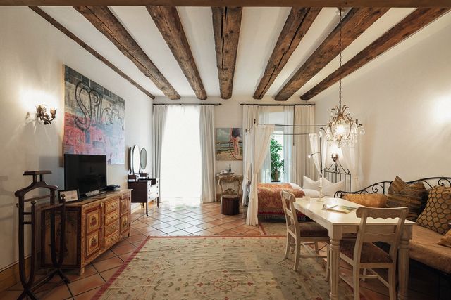 Der Andreasstadel, ein riegelförmiger Bau mit spitzem Giebeldach, gehört zum »Hotel Orphée«, einer der schönsten Herbergen der Stadt. Das merkt man schon in der eklektischen Lobby mit Weltzeituhren (Tahiti!), Chesterfield-Sesseln und Klavier. Trotzdem fühlt man sich dank kleiner Küche und dörflicher Abgeschiedenheit eher wie in einer Ferienwohnung. Zu Fuß sind es zehn Minuten in die Altstadt mit ihren Sehenswürdigkeiten. Eine davon liegt auf dem Weg: die »Wurstkuchl«, die schon auf Stadtansichten des 17. Jahrhunderts verewigt ist.