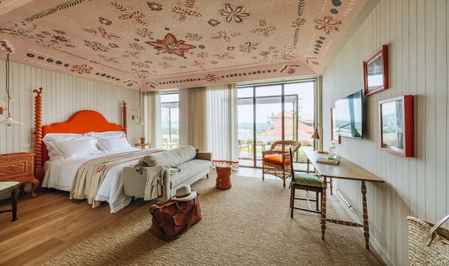Man könnte so viel erleben. In knapp 50 Minuten wäre man vom Hotel »Solar de Vila Meã« mit dem Auto in Porto. Man könnte dort am Douro entlangspazieren und zwei bis drei Pastéis de Nata in der »Manteigaria« essen. Nach Guimarães, deren Altstadt zum UNESCO-Weltkulturerbe zählt und die als »Wiege der Nation« bezeichnet wird, würde es nur eine gute halbe Stunde dauern. Man könnte auch die 581 Stufen zur Kirche »Bom Jesus do Monte« in Braga emporsteigen. Wem das zu anstrengend ist, könnte eines der vielen Weingüter der Region besuchen und Vinho Verde verkosten. Der wird als grün bezeichnet, aber kann aus weißen oder roten Trauben bestehen – »Vinhos Verdes« ist die geschützte Herkunftsbezeichung für die Anbauregion im Nordwesten Portugals. So viele Ausflugsmöglichkeiten – und so weiche Kissen. Noch liegt man in diesem komfortablen und opulenten Bett. Im Halbschlaf lässt man per Fernbedienung die Verdunkelung der Fensterfront hochfahren. Der Vorhang hebt sich und eröffnet den Blick auf die umliegenden Weinberge sowie eine private Terrasse. Dieses Licht! Man schaut sich im Hotelzimmer um und befindet, dass Terrakotta, Rosé und Apfelgrün eine fabelhafte Farbkombination sind. Vielleicht schafft man es später noch an den Pool mit den rot-weißen Sonnenschirmen, ins hoteleigene Restaurant »Barro« am Abend auf jeden Fall. Doch fürs Erste sinkt man tiefer in die Laken, blickt zur bemalten Decke, umarmt ein Kissen – und reist in Gedanken, wohin man will.