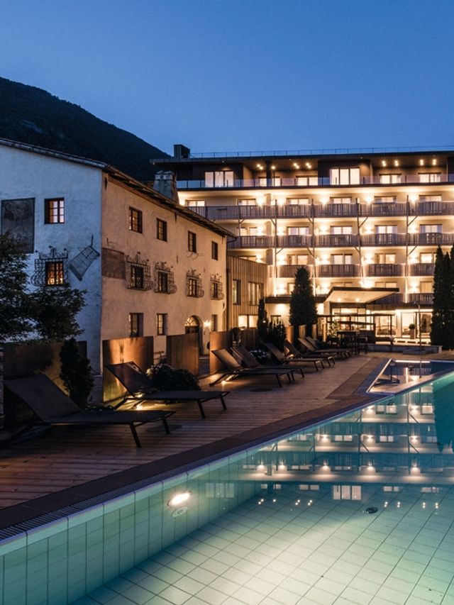 Fünf Jahre ist es nun her, dass Hansjörg Dietl die ersten Reben in seinem Weingarten in Goldrain am Fuße des Vinschger Sonnenbergs pflanzte. Von dort kann er das Martelltal überblicken und der Etsch beim Fließen zuschauen. Für den Hotelier ist der kleine Weinbau mehr als nur eine Leidenschaft. Denn damit knüpft er an eine 900 Jahre alte Familientradition an, die wenige Kilometer vom Weinberg entfernt mitten in Latsch ihren Anfang nahm. Dort im »Matill«, dem ältesten Gebäude im Ort, ist Dietl aufgewachsen. Die schmiedeeisernen Verschläge stammen noch aus dem 14. Jahrhundert, und beim Anblick des Anwesens wundert es nicht, dass Familie Dietl ihr Zuhause auch als »Schlössl« bezeichnet. Das historische Gebäude wurde um einen modernen Anbau mit Zimmern und Suiten, Restaurant, Indoor- und Outdoorpool sowie Spa erweitert. An manchen Tagen empfangen Hansjörg Dietls Ehefrau Charlotte und seine Tochter Johanna die Gäste auf der Dachterrasse zum Apéro. In der ehemaligen Selchküche im historischen Schlössl, wo früher Schinken von der Decke hingen, finden heute Massagen und Wellnessbehandlungen statt.