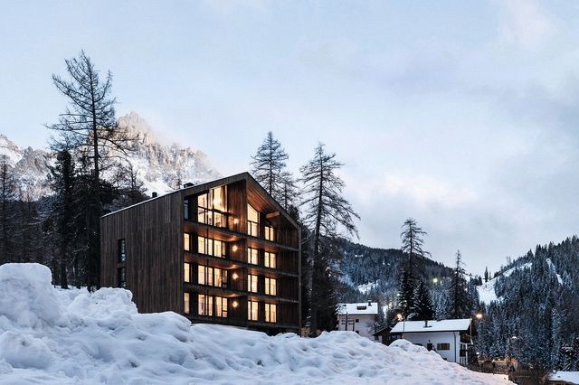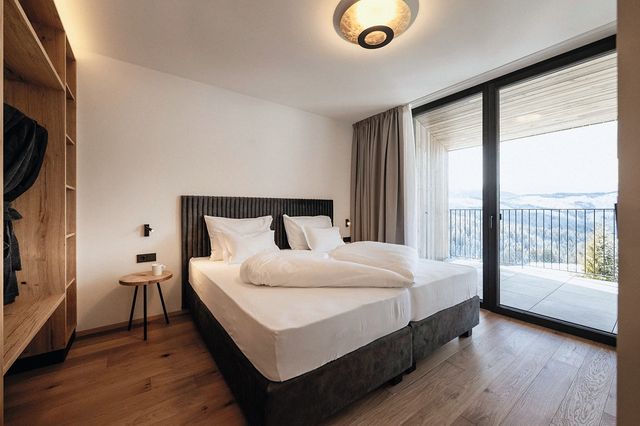 Anders ist es in den neuen Eco-Lodge-Apartments des Familienhotels »Maria« im Skigebiet Obereggen in Südtirol: In den zehn Wohnungen können bis zu sechs Familienmitglieder Urlaub machen, aber – gegen Gebühr – auch alle Services des Hotels schräg gegenüber nutzen: Frühstücksbuffet, Drei-Gänge-Menü am Abend, Schwimmbad und Spa, Kinderclub. Wer lieber im Apartment bleibt, kann einen Koch oder BBQ-Service buchen – oder für sich einkaufen lassen: Milch, Eier, Brot nimmt man aus einem Schrank vor dem Apartment, den man mit der Zimmerkarte öffnet. Die Wohnungen heißen »Sky Loft« oder »Alpine Family« und sind mit viel Holz gebaut, trotzdem sehr hell durch die hohen Fensterfronten.