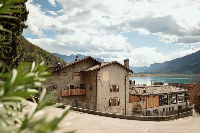 Die eigentliche Sensation hier aber ist der kleine Spaziergang zwischen Zypressen und Weinreben hinunter zum Seegrundstück mit Palmen – jeder Gast hat einen Schlüssel. Dort warten dann eine Bootshütte mit Surfbrettern und ein paar gestreifte Sonnenschirme, die auch irgendwie nach früher aussehen. Auf dem Weg zum Steg kann man sich aus dem Kühlschrank im Bootshaus ein Glas Wein oder eine Limonade mitnehmen. Der Kalterer See erwärmt sich, ganz gegen seinen Namen, schnell, seine kleinen Wellen glitzern in der Nachmittagssonne, und alles hier ist so friedlich und nett, dass man sofort auf der Sonnenliege eindöst. Wenn man aufwacht, ist das hauseigene Tretboot wieder am Steg vertäut und schaukelt einladend. Eine kleine Runde damit hinaus und zwei, drei Kopfsprünge vielleicht? So vergehen die Tage hier, ein Buch, ein Handtuch, viel mehr braucht man gar nicht. Ferien, denkt man, wie sie vielleicht die Großeltern schon gemacht haben. Ferien wie früher.