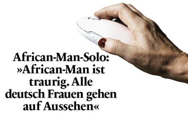 Der Zweite war ein Schwarzafrikaner, der sein Profil mit »African-Man-Solo« überschrieben hatte: »Du gefällst mir!«, schrieb African-Man-Solo. »Bin sehr einsam. Seit sechs Jahren habe keine Freundin. Seit acht Jahren bin in Germany. Es ist kalt hier. Viele Frauen mögen nix African. Und du? Ich kann auch nix gut deutsch!«