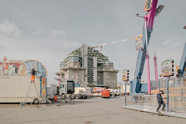 Es lag auf der Hand, dass Grapatin da die vielen Hochbunker ins Auge stechen mussten, die ab 1940 zum Schutz vor den Luftangriffen der Alliierten in Deutschlands Städten errichtet wurden und oft heute noch stehen. In Hamburg sieht man besonders viele. Der prominenteste ist dort der Flakturm auf dem Heiligengeistfeld, der heute so zur vertrauten Kulisse von Spielen des FC St. Pauli gehört wie die Fahnen der Fans. Seit er unlängst noch spektakuläre Dachaufbauten bekam (Hotel, Kongresszentrum plus Wald mit Wanderpfad), wirkt er wie eine weitere Attraktion zwischen den Fahrgeschäften des Jahrmarkts, der auf dem Gelände davor dreimal im Jahr stattfindet.