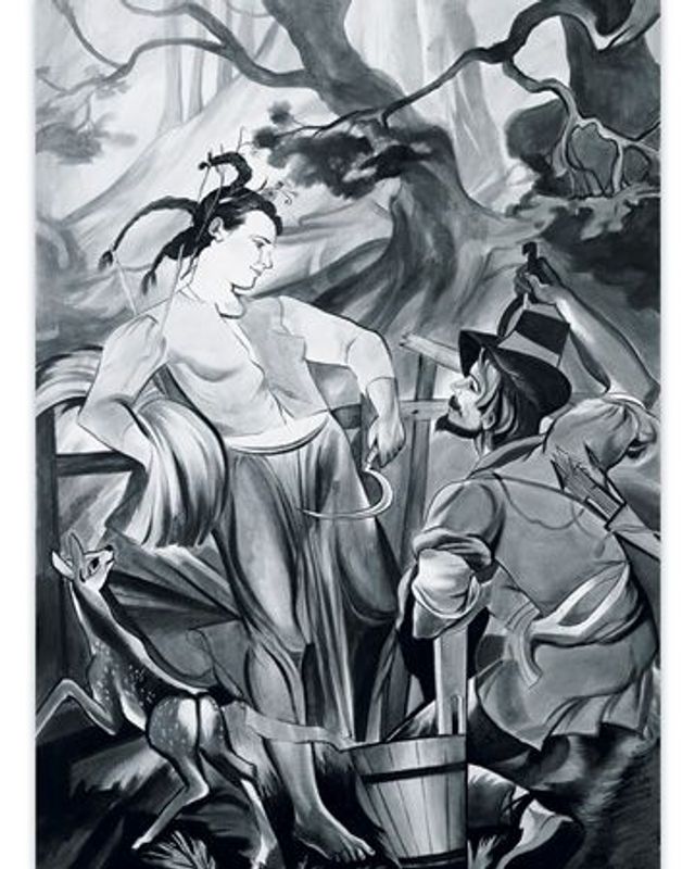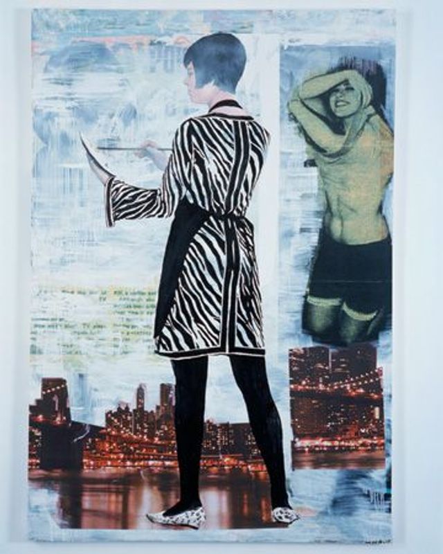 Die hat mir ein Künstlerfreund aus Deutschland geschickt. Für ihn war es das »lustigste Bild des Monats«, und ich fand es auch komisch. Es stammt aus einer Moncler-Anzeige der Herbst-/Winterkampagne 2009. Die habe ich auf eine Seite aus einem James-Whistler-Bildband geklebt, auf der Tinte ausgelaufen war. Zum Schluss habe ich ein paar weiße Zeichnungen draufgemalt. Alles zusammen ergibt ein Bild, dessen Elemente scheinbar nicht zusammenpassen, hinter denen sich aber eine ungeschriebene Geschichte verbirgt.