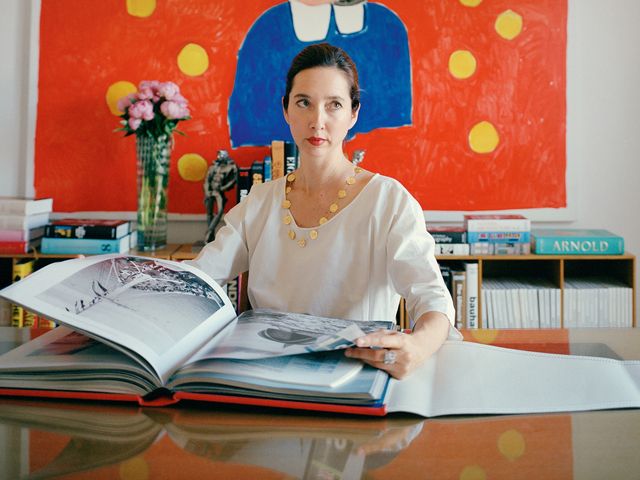 Marlene Taschen in ihrem Büro mit dem Bildband America’s Cup, Covergestaltung von Marc Newson. An der Wand hinter ihr ein Werk des deutschen Künstlers André Butzer.