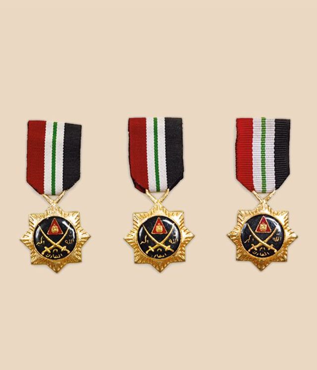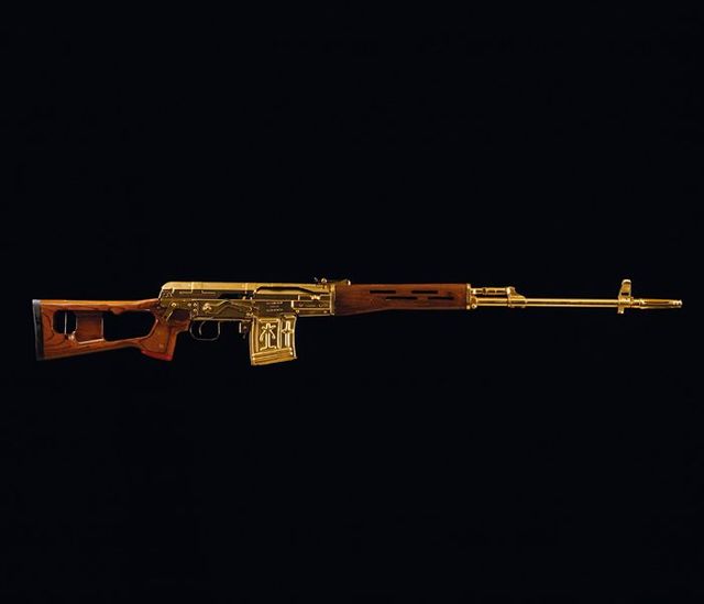 Auch diese Fotos handeln von Verdopplungen. Zum Beispiel die goldbeschichteten Gewehre, die von US-Soldaten in Udais Palast beschlagnahmt wurden: Die AK-47 ist das Symbol der Revolution, es wird in der ganzen Welt in Kriegen eingesetzt. Hier bekommt es als Symbol für Reichtum und Macht eine weitere Bedeutung. Auf der einen Seite hat Saddam Hussein übrigens eine Widmung eingravieren lassen.