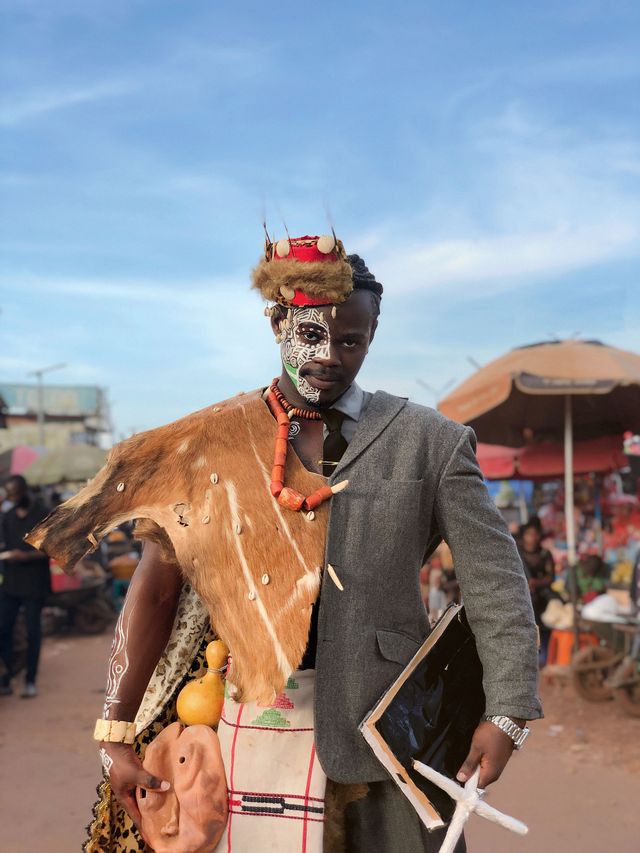 Vor Kurzem habe ich ein Kostüm zum nigerianischen Unabhängigkeitstag angefertigt, der war am 1. Oktober. Es besteht aus zwei Teilen, auf der einen Seite ein grauer Anzug, der das Christentum repräsentiert. Auf der anderen Seite verschiedene Tierhäute, die traditionelle Kleidung der Igbo, zu der Ethnie gehöre auch ich. Diese Seite repräsentiert, wen wir verehrt haben, bevor die weißen Männer nach Afrika kamen und uns sagten, unsere Götter seien nicht die richtigen Götter. Seitdem gibt es immer wieder Diskussionen und sogar Kämpfe darum, welche Religion und welcher Gott überlegen sein soll. Ich habe die beiden Seiten zusammengenäht und wollte damit diese Dualität zeigen – und die Möglichkeit von Koexistenz der unterschiedlichen Religionen in Nigeria thematisieren. Als ich damit herumlief, riefen mir viele Leute zu, dass ich weitermachen soll.