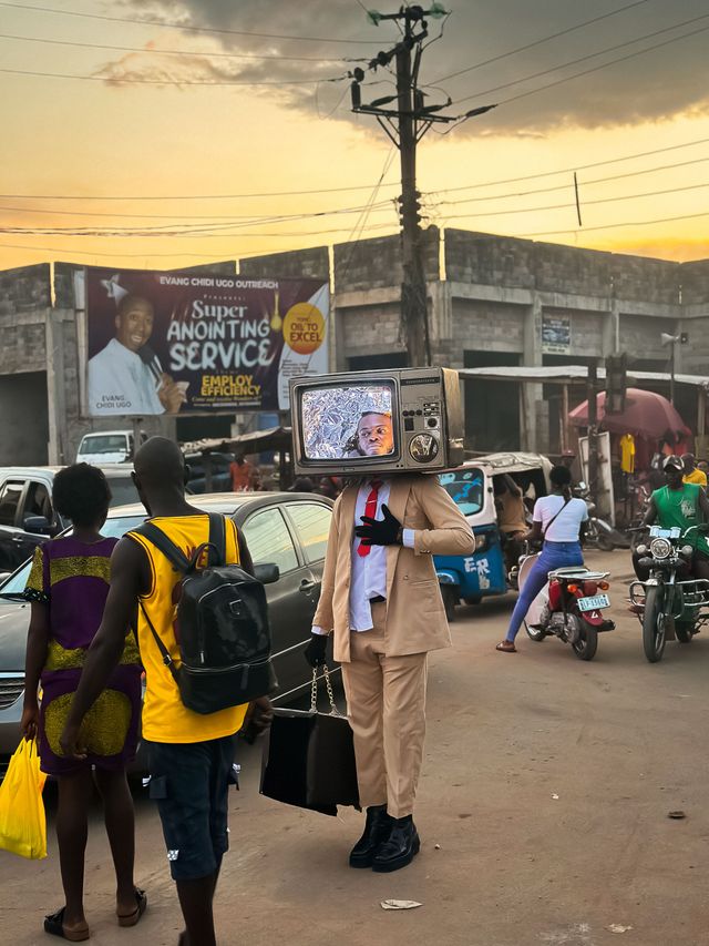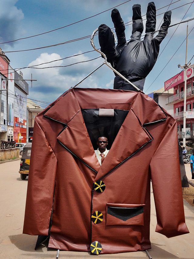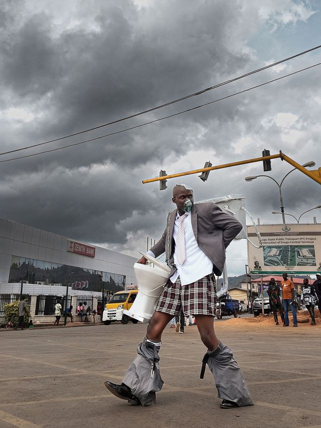Sehen mich Passanten in meinen Kostümen oder mit meinen überdimensionalen Objekten in meiner Heimatregion Enugu in Nigeria auf der Straße, reißen sie die Münder auf, lachen ungläubig oder runzeln die Stirn. Genau diese Reaktionen will ich erreichen. Ich möchte die Menschen mit meiner Aufmachung irritieren, damit sie stehen bleiben und zu mir blicken. Sie sollen darüber nachdenken, was ich trage. Durch meine Kreationen kommentiere ich die Gesellschaft und die Politik in Nigeria. Es ist schwer, hier als einzelne Person auf der Straße seine Meinung zu äußern. Das kann gefährlich werden. Deshalb übersetze ich meine Ansichten in Textilien und Objekte. Meine Kunst ist visueller Protest.