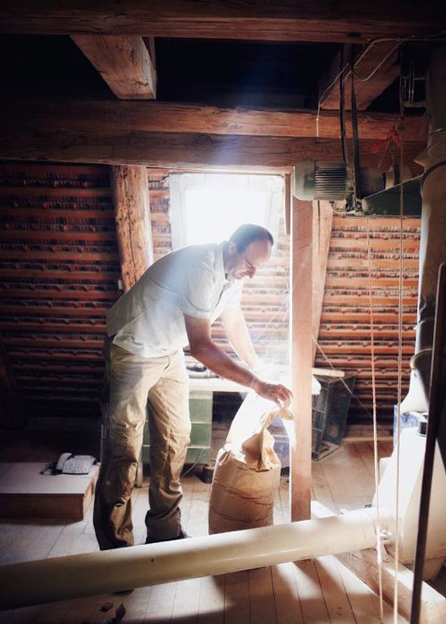 Im Spätsommer war Hochsaison, die Mühle mahlt etwa zwei Tonnen Getreide pro Stunde. Litz, ein schlaksiger 35-jähriger Mann. Griffig ist sein Mehl, es ist nämlich einen Hauch gröber gemahlen als gewohnt. Und hierin liegt eine Kunst des Müllers: Er versucht die Schalen möglichst sauber vom Mehlkörper zu trennen, ohne das Korn allzu fein zu mahlen. Dafür läuft das Getreide über mehrere Walzenstühle, die es immer feiner zerkleinern. Zwischen den einzelnen Mahlgängen werden Grieß, Mehl und Kleie brachial gerüttelt und geschüttelt durch verschiedene feine Siebe. Alles zusammen macht einen Lärm wie auf dem Nürburgring, und wenn Litz hier ein Schräubchen dreht und da den Mahlgrad nachjustiert, dann wirkt er tatsächlich wie ein Mechaniker, der das Allerletzte aus seinem Formel-1-Ferrari herauskitzelt. Das warme Mehl duftet und greift sich angenehm an - griffig ist ein gutes Wort dafür. Es macht sicher Spaß, damit Teige zu kneten oder auszurollen. Doch wird damit auch mein Krustenbrot noch knuspriger und luftiger?