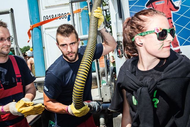»Weil sie sich reingeschissen haben«, sagt Werner und zeigt wie zum Beweis auf eine Unterhose, die im Matsch vor der Toilette liegt, die Markus gerade leer saugt. Nach 30 Sekunden ist er fertig. Jede seiner Bewegungen wirkt präzise und kraftvoll. Ein Profi auf einem Schlachtfeld voller Amateure. Es ist ein überraschender Anblick: Die einzigen beiden Personen, die an diesem heißen Samstagmittag Würde ausstrahlen, sind die beiden Männer, die die Fäkalien beseitigen.