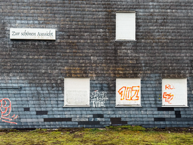 Zunächst durch Zufall stieß sie auf weitere Orte mit dem verheißungsvollen Namen. Das Panorama: Bauzäune, asphaltierte Straßenkreuzungen, verlassene Klettergerüste, heruntergelassene Jalousien. Der Kontrast faszinierte sie, und Grabowski fing an, gezielt nach Deutschlands »schönen Aussichten« zu suchen. Grabowski, Jahrgang 1981, lebt inzwischen in Bremen und arbeitet als Pressesprecherin. Der Fotografie widmet sie sich in ihrer Freizeit, also fuhr sie auf dem Weg zu Freunden in anderen Städten nun Umwege über Landstraßen, fotografierte Schilder und Raststätten.