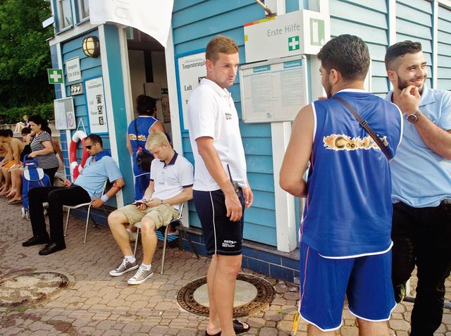 Wir machen nicht nur die Arbeit, für die wir bezahlt werden, sagt Sven, Wasserqualität kontrollieren, Badebetrieb bewachen: Wir sind Sozialpädagogen. Manche der Jugendlichen haben sie groß werden sehen, sie waren für sie da. Man kann was erreichen, sagt Sven. An den Wochenenden sieht man im ganzen Bad Männer und Frauen in blauen Basketballtrikots, auf denen »Bleib cool am Pool« steht. Die Idee hinter der gemeinsamen Aktion von Berliner Bäder-Betrieben, Polizei und Gesellschaft für Sport- und Jugendsozialarbeit: Jugendliche, die mal Mist gebaut haben, hindern andere Jugendliche daran, Mist zu bauen. Gemeinsam mit einigen älteren Ehrenamtlichen patrouillieren sie durchs Bad. Wow, geil, die Cool-Polizei kommt, ruft Nasser ihnen zu.