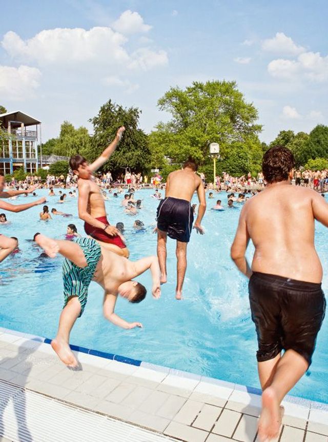 Nassers Jungs, 15, 16, 17, 18, entweder mit Sixpack oder mit Wampen, die denen der Familienoberhäupter nacheifern, die am Kiosk sitzen, haben ihre Handtücher wie jeden Tag um den Bademeisterturm verteilt. Viel Gelächter, viel Testosteron. Sie johlen den Mädels nach, es ist wie in jedem Freibad, man wartet darauf, erwachsen zu werden, und zieht sich währenddessen aus und guckt, wie die anderen ausgezogen aussehen. Es riecht nach Chlor, Schweiß und Sonnencreme, und irgendjemand wird von einer Wespe gestochen – trotzdem ist es anders. Seit der Eskalation an Pfingsten wirkt es wie eine Belagerung. Nasser drängelt sich an der Schlange vor dem Sprungturm vorbei und klettert ganz hoch. Das ist sein Turm. Er klatscht in die Hände. Die Jungs und Mädchen unten klatschen mit.
