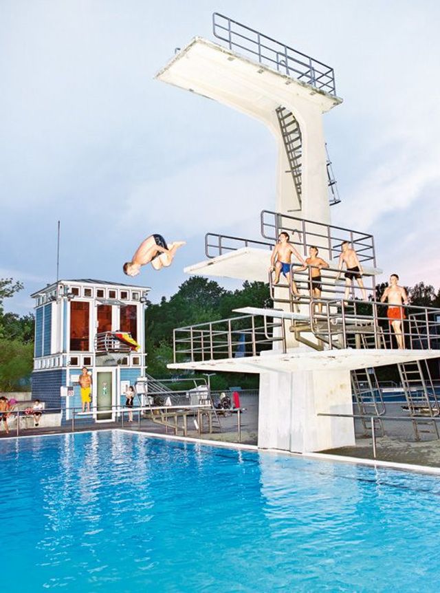 Da oben sind sie ganz groß, sagt Sven. Von da erscheint Neukölln weit weg, ganz klein, sie sehen auf einmal mehr von der Welt. Viele von denen waren noch nicht mal in Mitte, sagt Sven. Nasser macht eine gekonnte Schraube vom Zehner. Dieses dumpfe Platsch, das in regelmäßigen Abständen vom Sprungbecken kommt, wird nur unterbrochen von der geduldig sanften Stimme des Kollegen Mike aus dem Megafon: »Einzeln auf den Sprungturm!« – »Leute, bitte!« Sie bewachen den Sprungturm nun mit preußischer Genauigkeit. Natürlich könnten sie den Turm abreißen, die Rutsche, die Sprungblöcke. Könnten das Bad unattraktiv machen, damit die Spinner nicht mehr kommen. Aber das ist doch irre, sagt Sven. Erstens: Sie brauchen dringend Badegäste, an heißen Wochenendtagen auch mal 5000 Leute, sonst wird das ein Verlustsommer. Das Land Berlin musste 2012 rund 43,4 Millionen Euro Defizit der Berliner Bäder-Betriebe ausgleichen. Seit diesem Sommer kostet ein reguläres Tagesticket satte 5,50 Euro. Die Personaldecke ist eh schon dünn, die Gewerkschaft Verdi hat nach den Ausschreitungen an Pfingsten beklagt, dass sich zu wenige Bademeister um zu viele Badegäste kümmern. Zweitens: Sie haben einen Versorgungsauftrag. Sie versorgen die Berliner mit Spaß. Hat halt jeder seine eigene Definition von Spaß.
