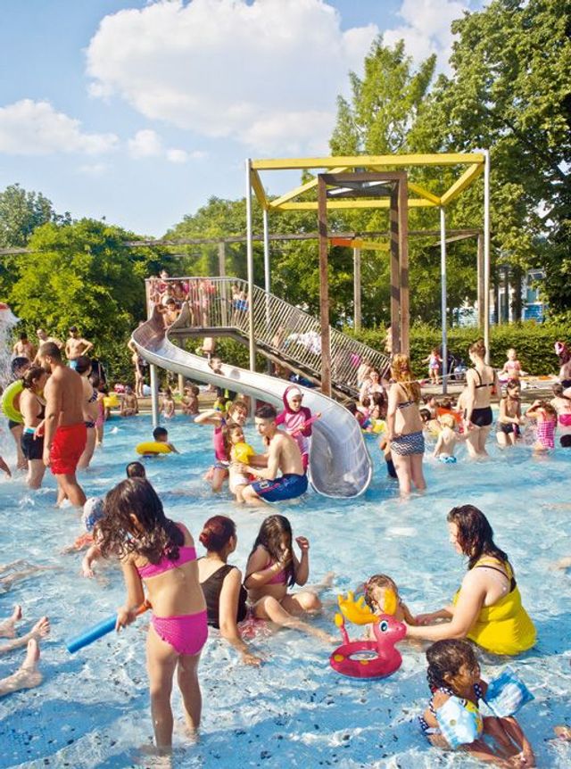 An diesem ersten heißen Wochenende seit Pfingsten also, 28 bis 32 Grad, zwölf bis 20 Securitys, wird sich zeigen, ob das neue Konzept funktioniert. Familienbatt. Das ist der Test, sagt Sven. Die Frage ist, wie es weitergeht mit dem Sommerbad Neukölln, so der offizielle Name, zwischen Tempelhofer Feld und Hasenheide gelegen, mit 83-Meter-Rutsche, 50-Meter-Schwimmbecken, Babybecken und Wasserpilz. 1951 eröffnet zur Abkühlung für die Nachkriegsbengel. Ist viel passiert seitdem. Nebenan landen keine Rosinenbomber mehr, da steht jetzt eine Moschee.