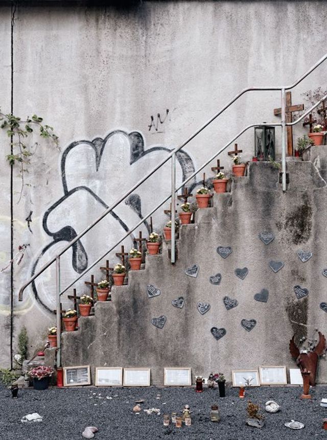 Dort, wo sich die Menschen verknäulten und zu Tode gequetscht wurden, stehen heute Grablichter, Kruzifixe und gerahmte Bilder von Todesopfern auf schwarzem Kies. Der Ort des Gedenkens ist staubig und laut, Lastwagen donnern vorbei. Wer ihn besuchen will, muss durch den langen schwarzverrußten Straßentunnel, der breiter als hoch ist. Die Rampe ist heute schmaler, denn der neue Grundstücksbesitzer, der Möbelunternehmer Kurt Krieger, hat sie verengen lassen. Irgendwann sollen oben auf dem ehemaligen Veranstaltungsgelände Möbelhäuser entstehen.
