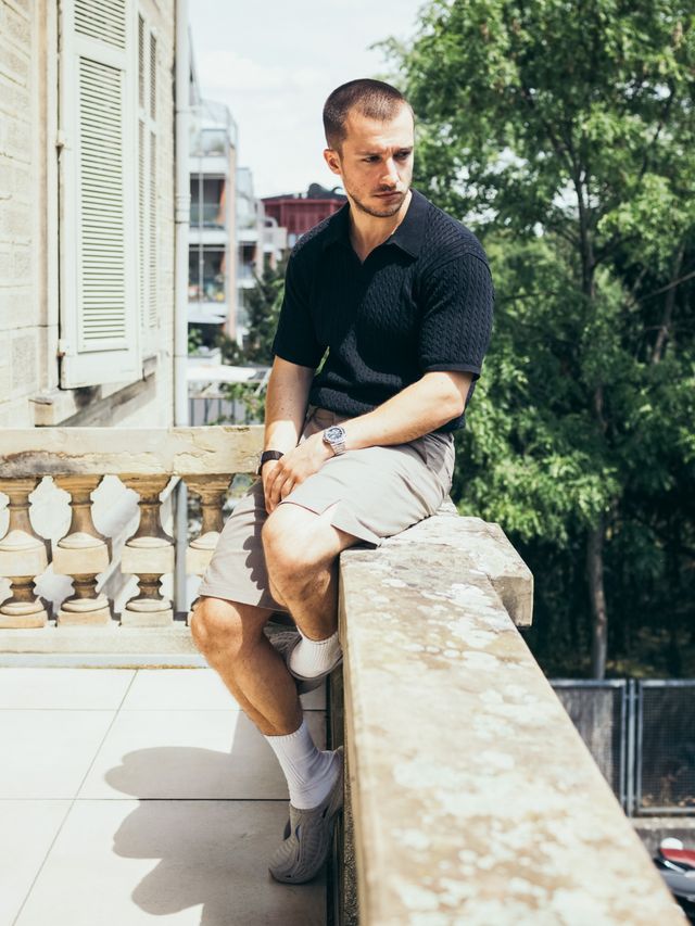 Dann tritt Tim Gabel ein. Er ist von oben bis unten gekleidet in Stoffe seiner eigenen Modemarke olakala. Seine Füße stecken in Crocs, geformt wie Schlangenköpfe,