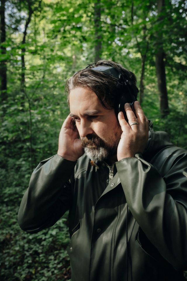 Per Kopfhörer prüft Joshua Bonnetta, ob alles richtig eingestellt ist – dann überlässt er seine Aufnahmege­räte sich selbst.