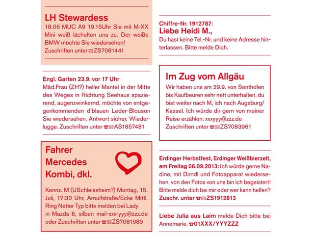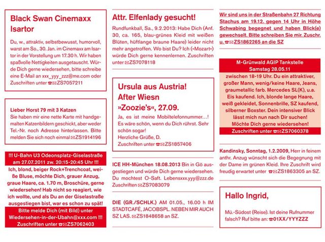 Ein schneller Blick, eine kurze Begegnung - und die Erinnerung lässt nicht mehr locker. Tag für Tag greifen Menschen nach der Hoffnung und schalten Anzeigen, um einander wiederzusehen. So entstehen unzählige kleine Dramen: