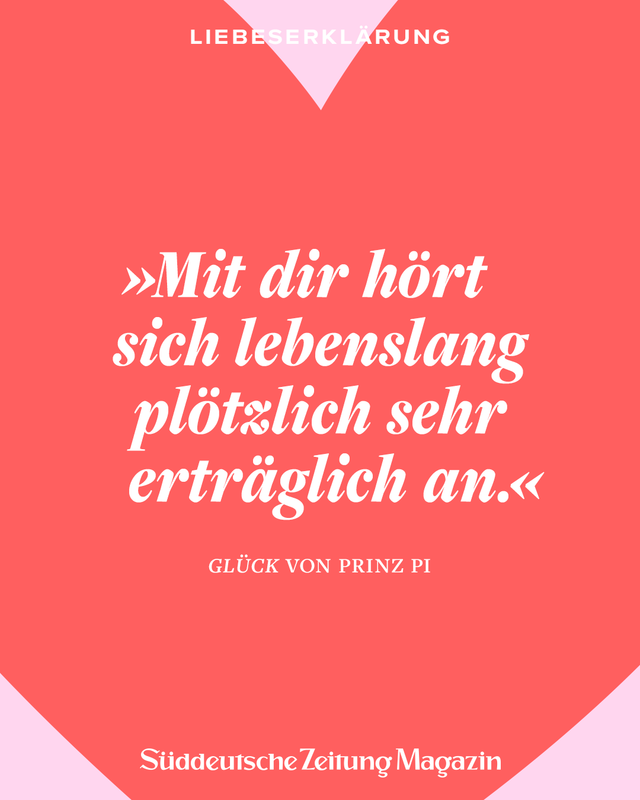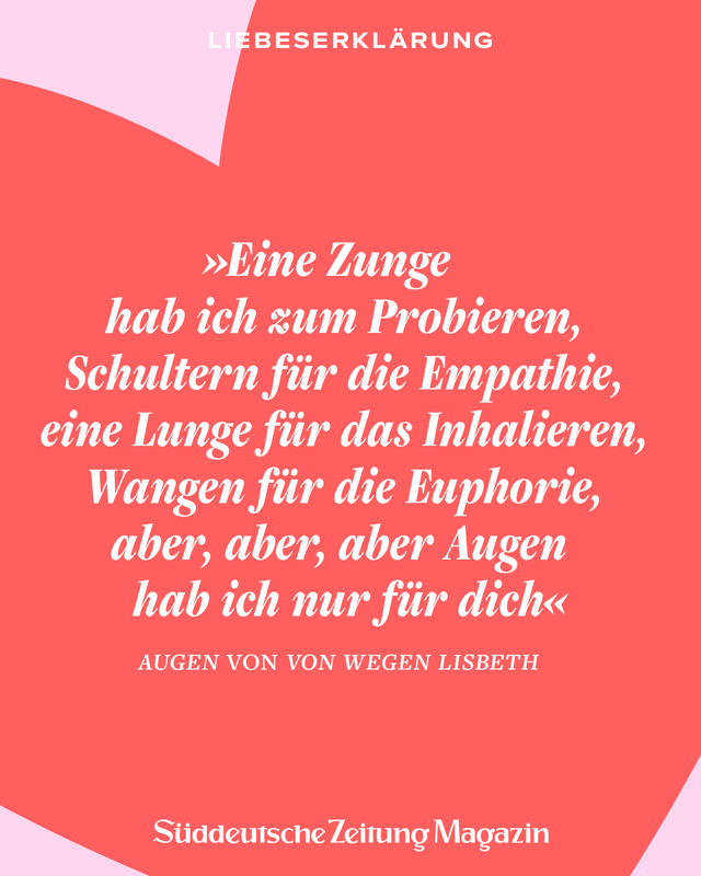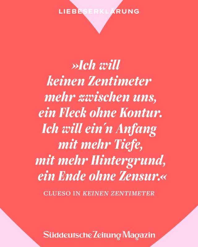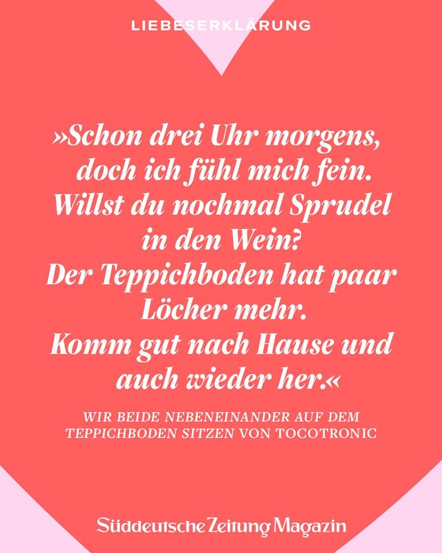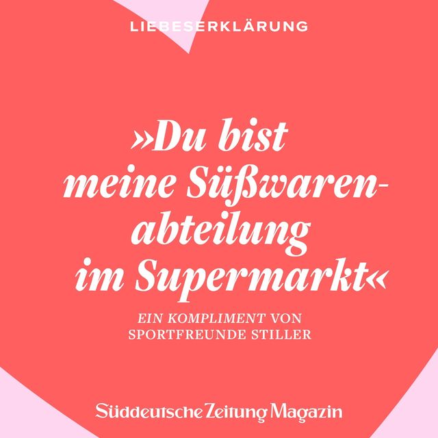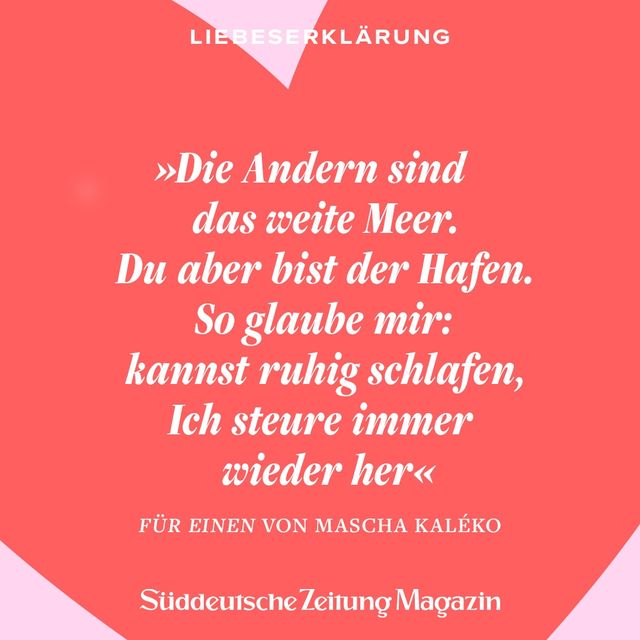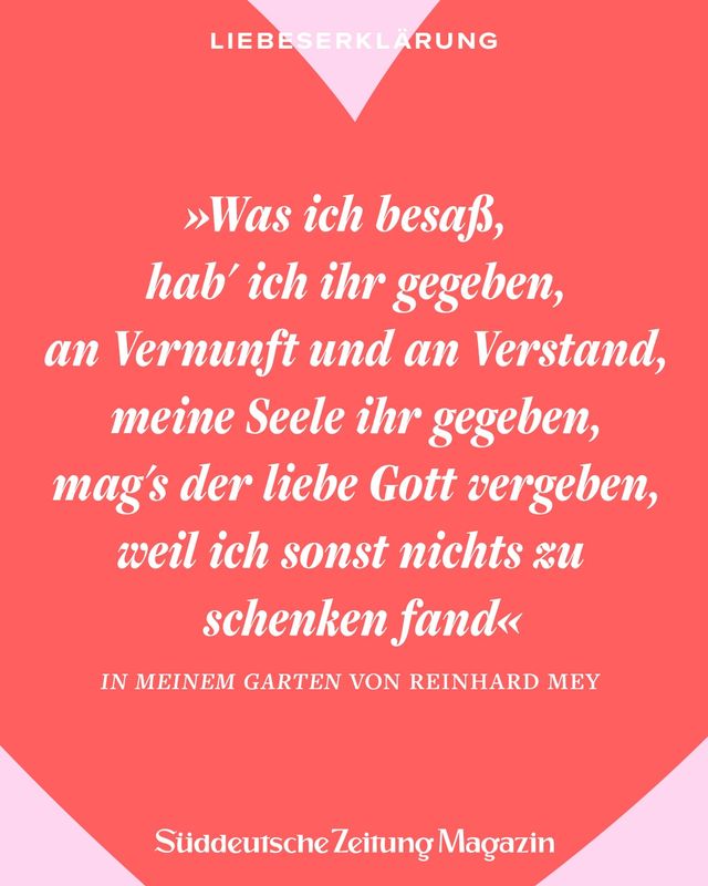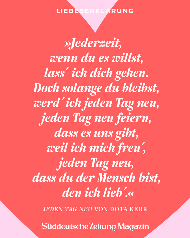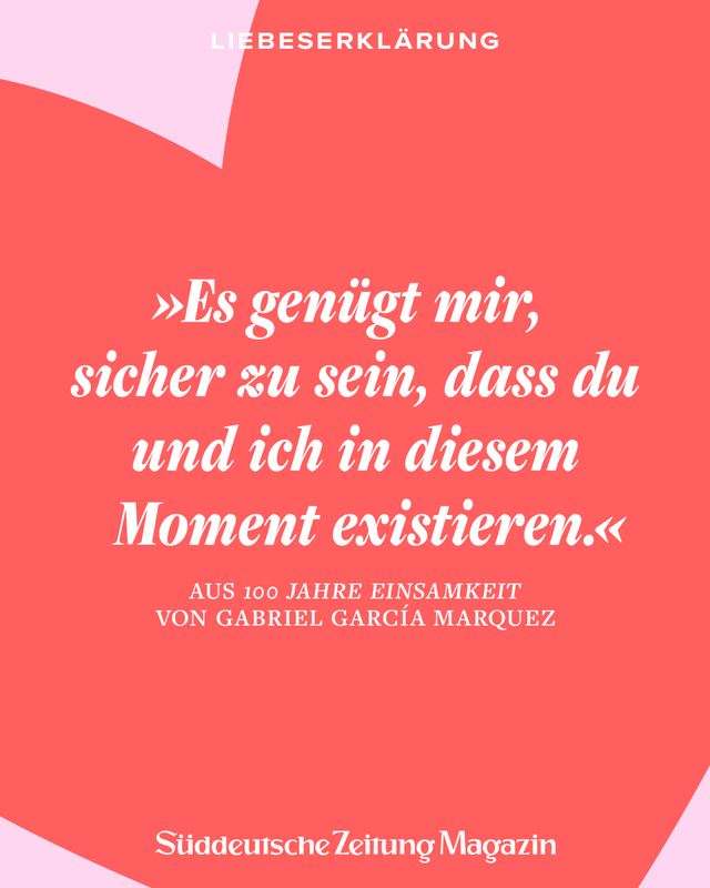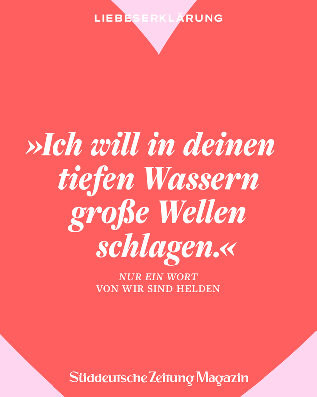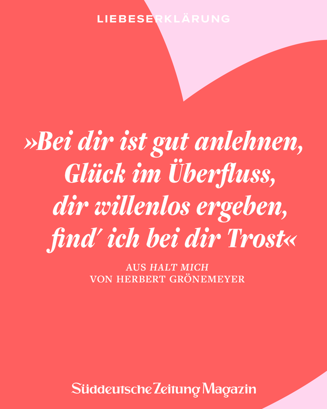 Jeden Sonntag finden Sie eine neue Liebeserklärung in unserem Newsletter »Alles Liebe«, außerdem Geschichten, Interviews und Essays über Beziehung, Dating und Sex. Und wenn Sie eine Liebeszeile kennen, die Ihnen ein warmes Gefühl bereitet, können Sie an allesliebe@sz-magazin.de schreiben.