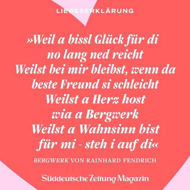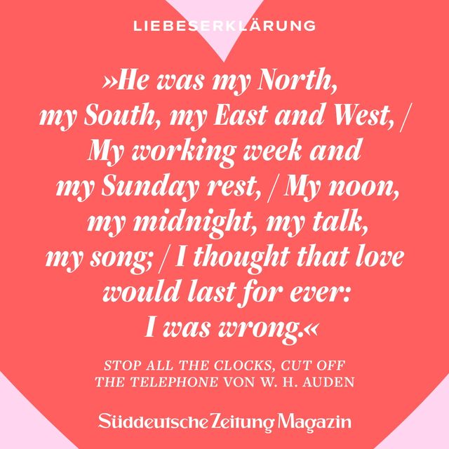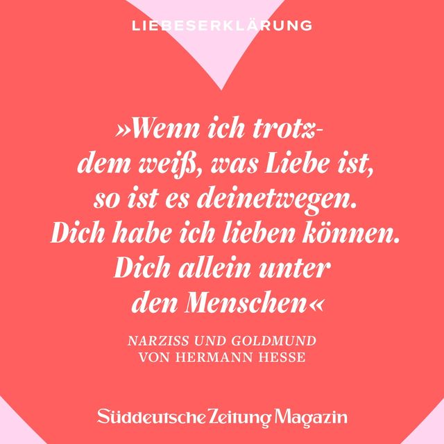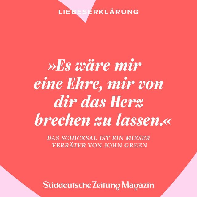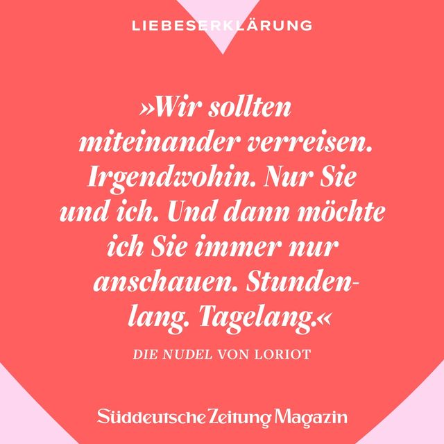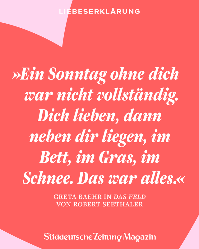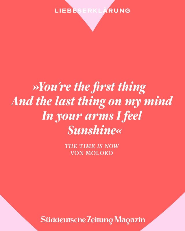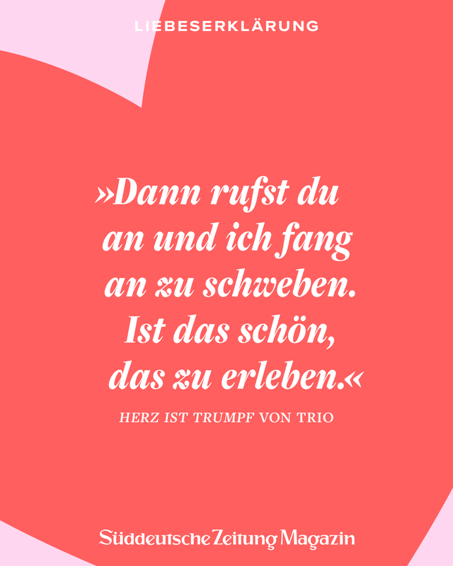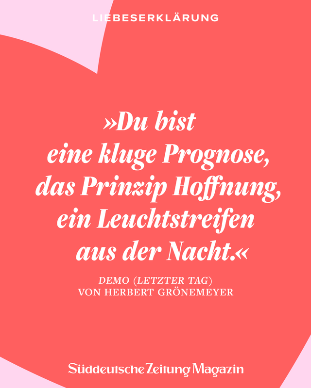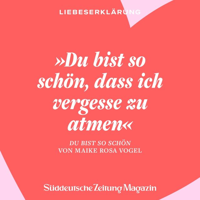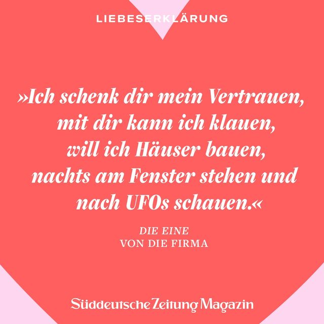 Jeden Sonntag finden Sie eine neue Liebeserklärung in unserem Newsletter »Alles Liebe«, außerdem Geschichten, Interviews und Essays über Beziehung, Dating und Sex. Und wenn Sie eine Liebeszeile kennen, die Ihnen ein warmes Gefühl bereitet, können Sie an allesliebe@sz-magazin.de schreiben.