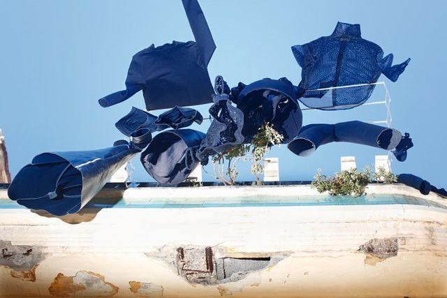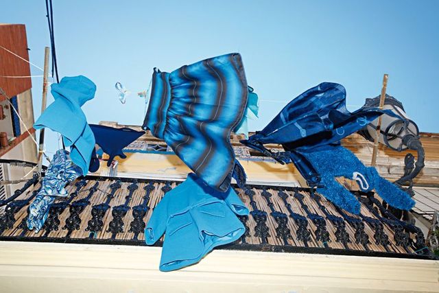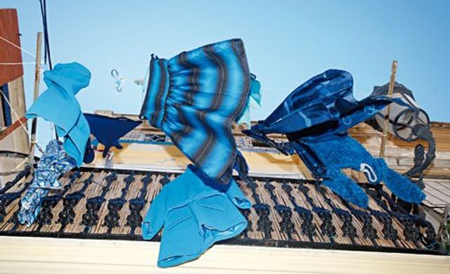 Im Herbst heißt es blaumachen – und zwar in allen Schattierungen. Von links: gemustertes Seidenkleid: Cacharel; Hose: Miu Miu; dunkelblaues Polo: Maison Kitsuné; Streifenkleid: Marc by Marc Jacobs; Mantelkleid: Miu Miu; dunkelblaues Kleid: Tommy Hilfiger; Pullover: Carven.
