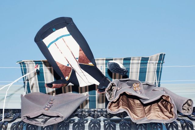 Broschen ersetzen Knöpfe, Applikationen glänzen wie Blattgold – wir tragen Schmuckmode statt Modeschmuck. Von links: Rock: Louis Vuitton; Kleid: Felipe Oliveira Baptista; Sneaker: New Balance; Jacke: Louis Vuitton.
