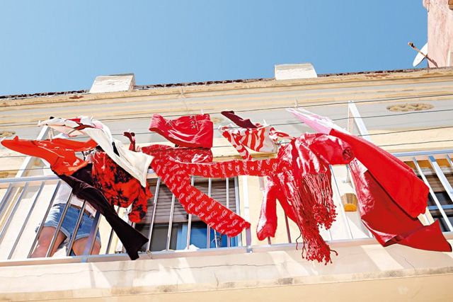 Deutliche Signale: Neben Knallrot darf es auch ein Schuss Bordeaux sein. Von links: Bluse: Roseanna; bordeauxfarbene Hose: Ralph Lauren; helles Kleid: Marni; Seidenbluse: JC de Castelbajac; Strümpfe: Falke; Hose: Vintage; Samtrock: Isabel Marant; Streifenpullover: Carven; Felljacke: Emporio Armani; Kleid: Jil Sander; Lederkleid: Bally.
