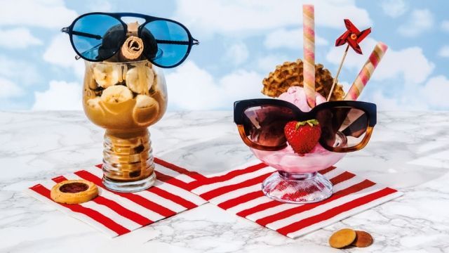 Fröhliches Bechern. Links: Brille von Michael Kors. Rechts: Brille in Aubergine, von Emporio Armani