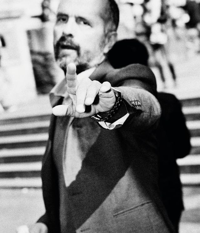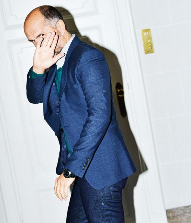 Hände hoch: Christoph Maria Herbst versucht, Gesicht zu wahren. Uhr »Hyper Chrome UTC« von Rado aus mattschwarzer Hightechkeramik. Sakko und Pullover von Burberry London. Hemd von Jil Sander. Jeans von Brunello Cucinelli.