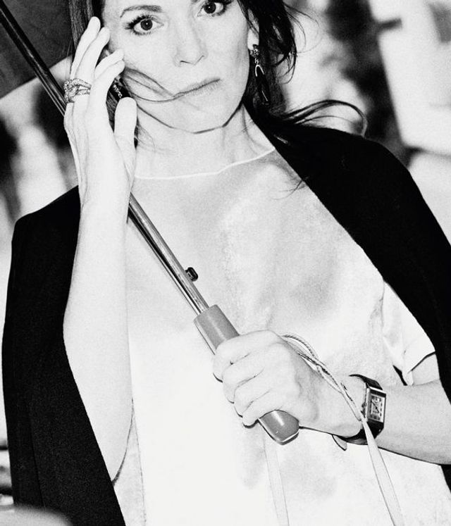 Iris Berben schirmt sich ab, so gut es geht. Uhr »Grande Reverso Night&Day« aus Rotgold, von Jaeger-LeCoultre. Ohrringe in Rotgold mit schwarzen Brillanten, Ring mit weißen und braunen Brillanten, beides von Pomellato.
