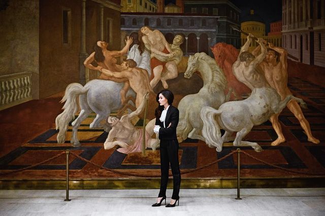 TEATRO MANZONI Ausnahmsweise kann man Silvio Berlusconi auch mal für etwas dankbar sein: Hätte er 1978 nicht das in finanzielle Schwierigkeiten geratene Teatro Manzoni gekauft, stünde auf der Piazza San Fedele statt des berühmten Schauspielhauses heute ein Supermarkt. 1850 eröffnet, war es das erste Theater mit elektrischem Licht in Europa. Im Foyer mit der prächtigen Wandmalerei traf sich die Mailänder High Society, um eine der legendären Macbeth- oder Maria-Stuart-Inszenierungen zu besuchen. Seit Luigi Foscale 1978 die kreative Führung übernahm, machte er das Manzoni wieder zu einem der angesehensten Häuser Italiens, das heute auch für modernes Varieté und Konzerte genutzt wird. Smoking, Schluppenbluse und Pumps: alles Saint Laurent by Hedi Slimane; Ohrring: Christ.