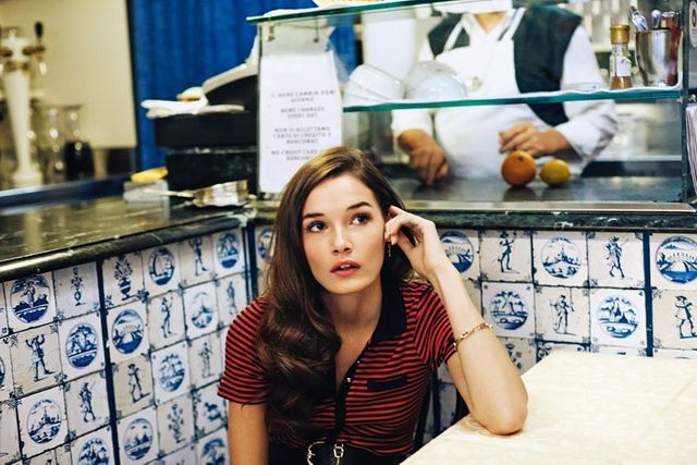 LA LATTERIA Früher gab es überall in der Stadt die »latterie«, kleine Milchläden, die hausgemachte Produkte verkauften. Einen der schönsten und gemütlichsten findet man noch heute mitten im Künstlerviertel Brera: »La Latteria« auf der Via San Marco. Schon seit 1965 führen Arturo und seine Frau Maria Maggi das kleine Lokal, in dem sie auch mit Zutaten aus dem heimischen Gemüsegarten im norditalienischen Borgonovo Val Tidone kochen. Von außen ist es eher unscheinbar, innen verleihen altmodische Fliesenmotive und mit Blumenbildern behängte Wände dem Bistro mit seinen nur sechs Tischen eine kitschig-nostalgische Wärme. Streifenbody: Petit Bateau x Carven; Jeans: Vanessa Seward für A.P.C.; Gürtel: Aigner; Kreuz-Kreole: Christ; Armband: Vintage.