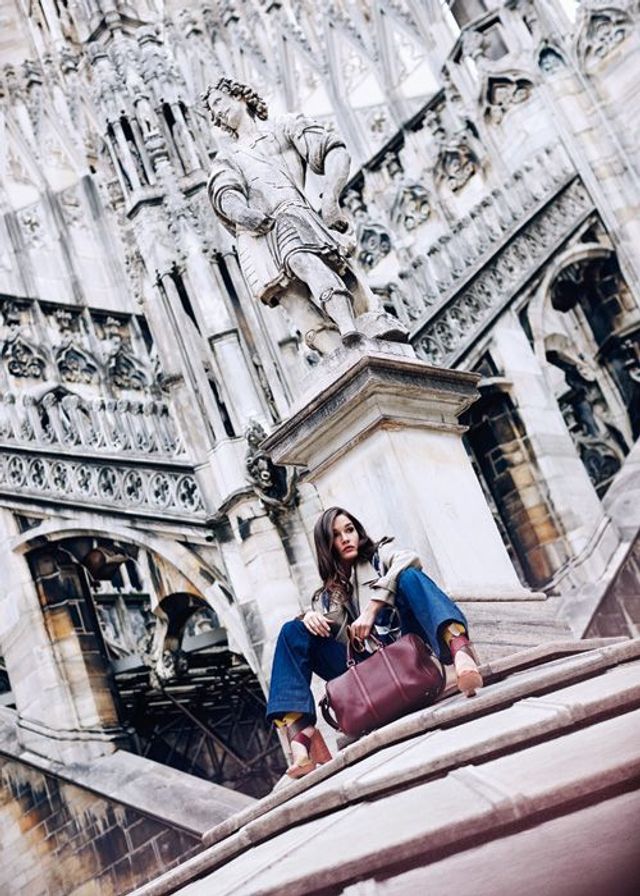 IL DUOMO Zum Dom müssen alle Mailandbesucher, das ist kulturhistorische Pflicht, katholische sowieso. Aber die wenigsten steigen auf sein Dach - und die anderen ahnen gar nicht, was sie verpassen: Bei gutem Wetter sieht man von hier oben die Alpen. Wem die knapp 160 Stufen zu viel sind, der nimmt eben den Aufzug. Trenchcoat und Sandalen: Chloé; Bluse: Marc O’ Polo; Schlagjeans: Vanessa Seward für A.P.C.; Seidenschal: Hermès; Tasche: Louis Vuitton; Sonnenbrille: Mykita.