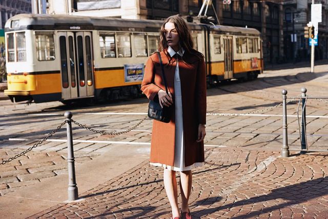 TRAM URBANI Ohne die Straßenbahn geht im Mailänder Verkehr gar nichts. Mit dem Auto steht man oft im Stau, Fahrrad fahren ist lebensgefährlich, und auf die U-Bahn ist kaum Verlass, in viele Gegenden der Stadt fährt sie sowieso nicht. Für Touristen sind die ratternden Waggons aus den späten Zwanzigern die perfekten Vehikel, um das historische Mailand und seine Sehenswürdigkeiten an sich vorbeiziehen zu lassen. Mantel: Marni; Blusenkleid: Jil Sander Navy; Handtasche: Hermès; Mokassins: Tod’s; Armband: Vintage.