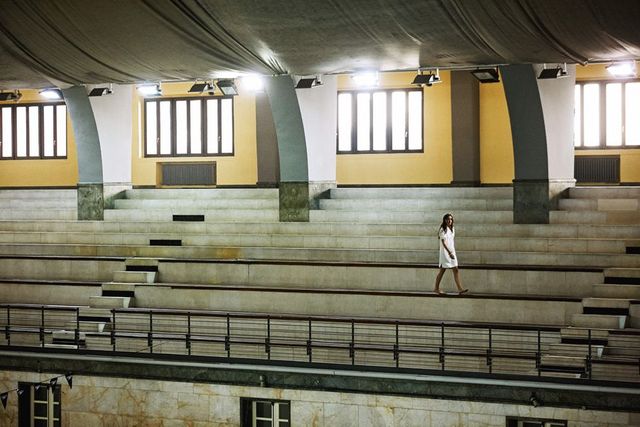 PISCINA COZZI Natürlich kann man in dieser Schwimmhalle auch ein paar Bahnen schwimmen, wenn das Wetter in Mailand mal wieder zu kalt, zu nass oder zu grau ist. Ein Besuch der Piscina Cozzi lohnt sich aber auch so: Die imposante Schwimmhalle von Luigi Secchi aus dem Jahr 1934 wurde 2008 aufwendig restauriert. Auch die Verzierungen mit Mosaiksteinen im Inneren wurden original erhalten. Die große Tribüne wird seitdem gern für Modenschauen genutzt. Kleid: Jil Sander Navy; Armreif: Marni.