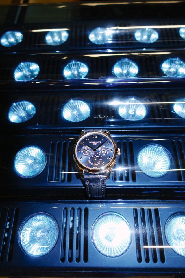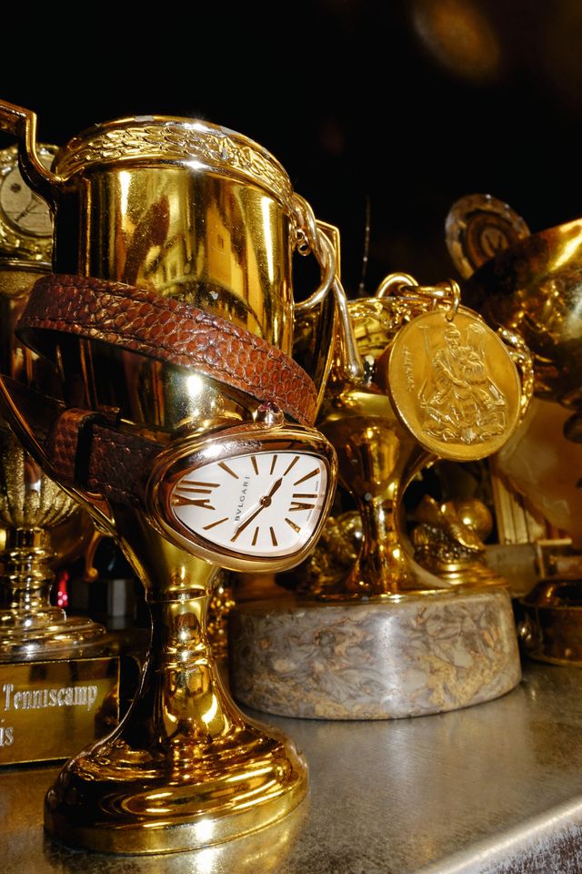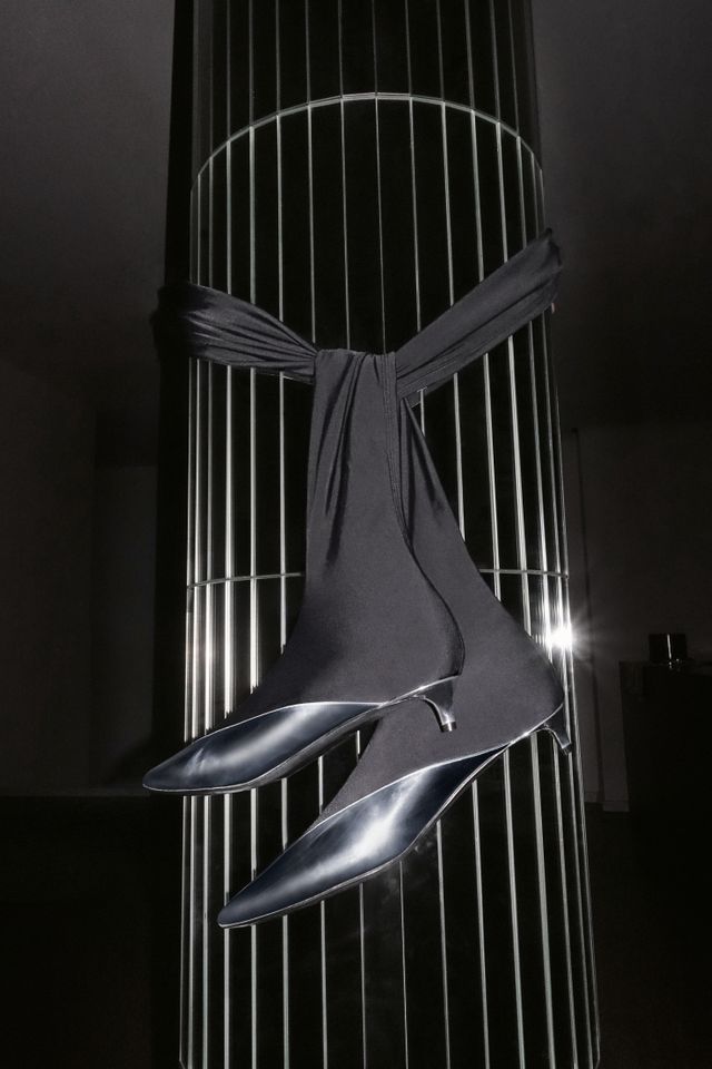 Strickjacke, Hose, Strümpfe und Sandalen von Gucci, die Lamettabox ist eine Anfertigung der Maskenabteilung für »Miunikh-Damaskus«.