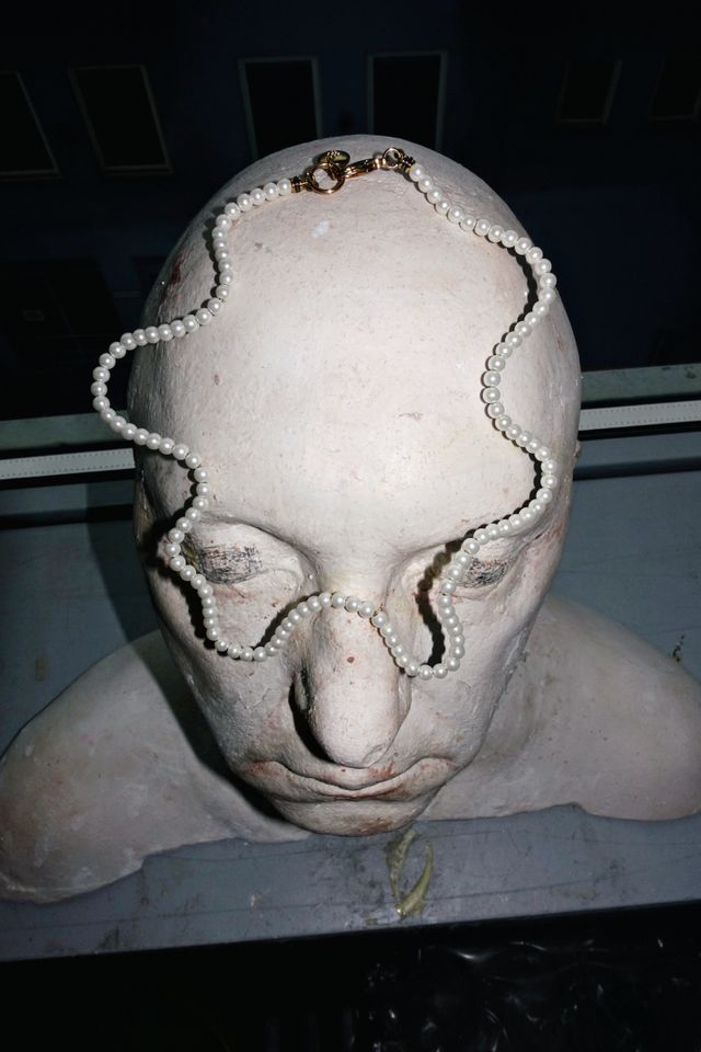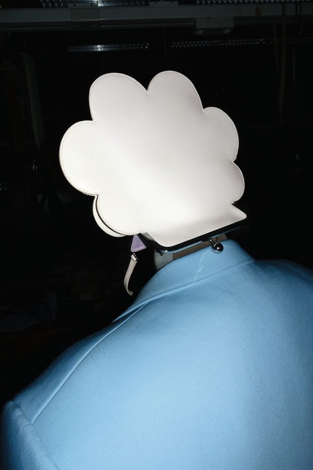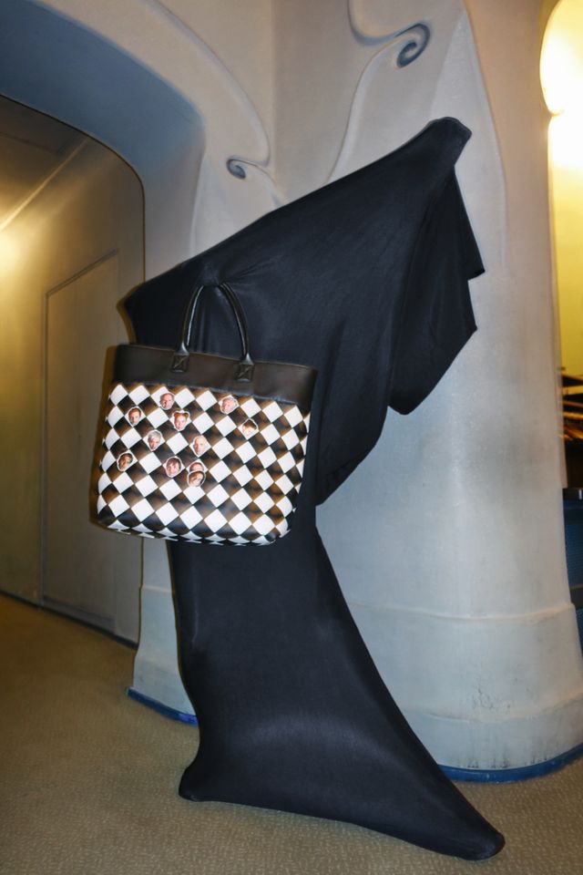 Sakko von Dries Van Noten, Tasche von Tod’s. Historisches Watteau aus dem Fundus der Münchner Kammerspiele. Netzteil auf dem Kopf von der Maskenabteilung der Münchner Kammerspiele.