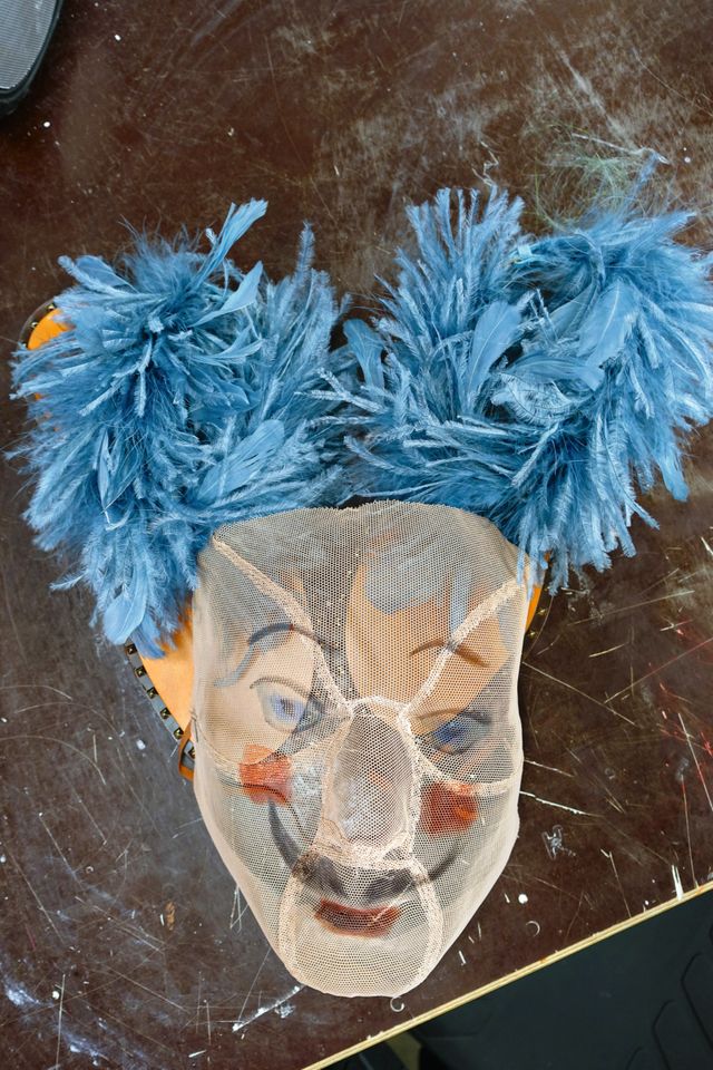 Jacke von Simone Rocha, Vogel-Kopfschmuck aus dem Stück »Nichts von euch auf Erden«.