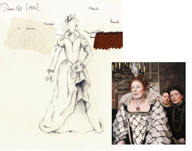 Auf dem runden Esstisch in ihrer Wohnung liegt aufgeschlagen eine Art schwarzes Ringbuch, groß wie ein Koffer. Darin auf jeder Seite eine Collage aus Bildern, Zeichnungen, Stoffproben; hier hat sie jedes Detail eines Kostüms für jeden Schauspieler in jeder einzelnen Szene dokumentiert, das war der nächste Schritt: Für Bild 24 und 25, bei dem sich die junge Elizabeth eine frühe Aufführung des Sommernachtstraums ansieht beispielsweise, hat Lisy sich für den Schnitt eines Kleides entschieden, das die echte Elizabeth auf einem Gemälde von 1557 trägt, sie hat das Bild aus einem Buch kopiert und aufgeklebt; der Stoff soll jedoch nicht rot sein wie auf dem Gemälde, sondern aquamarinblau, zur Verdeutlichung hat sie ein dreimal drei Zentimeter großes Stück blauer Seide mit einer Stecknadel angeheftet; das Mieder des Kleides bekommt ein Muster, das auf den Stoff aufgemalt wird, die Vorlage dazu stammt von einem anderen Bild, auch das klebt sie in Fotokopie daneben. Zum Kostüm der Königin gehören noch Unterrock, Schuhe, Strümpfe, Haarband und Kragen, auch dazu hat Lisy die Vorlagen aus verschiedenen Büchern kopiert. Dieselbe Prozedur: 150 Mal. Welches Maß an Organisation, Präzision, Konzentration und Fleiß ist da eigentlich gefordert, um den Überblick zu behalten? Auch den über das Budget? Jedes für die Königin angefertigte Kostüm kostete zwischen 3500 und 5000 Euro. Komplett, von der Krone bis zu den Schuhen. Lisy sagt: »Wenn du eine Königin ausstattest, kriegst du automatisch Respekt. Der kannst du nichts Billiges anziehen.«