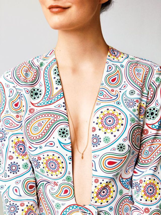 Den Ausschnitt bis auf Bauchnabelhöhe zu verlängern war bislang Männersache: Gunter Sachs, Tom Selleck, eine gewisse Fitnessstudio-Klientel – das siegessichere »V« konnte gar nicht weit genug in die Körpermitte hineinragen. Nun tun die Frauen es ihnen gleich, in Kleidern, Blusen und Jumpsuits, die nicht mal mehr aufgeknöpft werden müssen, sondern von vornherein tief blicken lassen. Dabei trugen sie doch gerade noch Blusen, zugeknöpft bis zur Unterlippe. Und das tun sie in ein paar Stunden vielleicht schon wieder, die Trends in der Mode laufen inzwischen etwa so einheitlich wie die Ansagen zur Euro-Rettung. Wohin das extratiefe V führt, ist nicht zu übersehen, dieser Ausschnitt funktioniert für Männeraugen wie eine frisch planierte Landebahn. Trotzdem wird hier am Ende weniger offenbart als bei balkonartig ausladenden Dekolletés. Ein V arbeitet verdeckt, es deutet an. Der Blick läuft: ins hübsche Nichts, irgendwo um das Zwerchfell herum. Eine Stelle des Körpers, die in Sachen Sexappeal noch angenehm unbefleckt ist. Bis zu diesem Sommer jedenfalls.