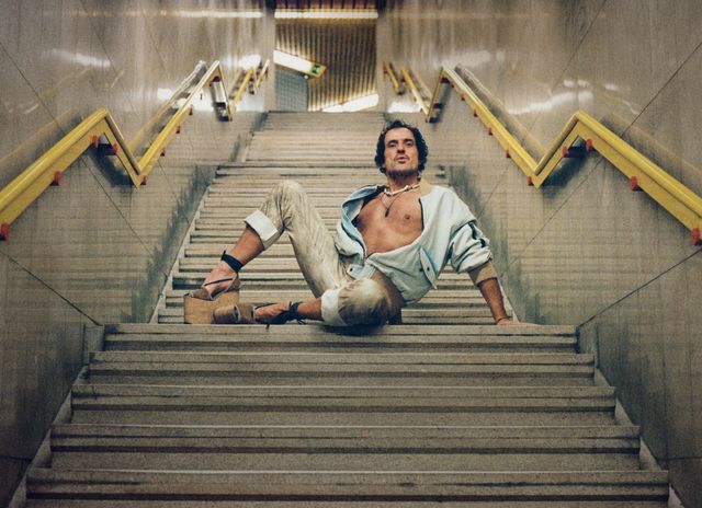Vom Schattenmann zum Showrunner: Kronthaler mit Plateauschuhen bei den Foto-Aufnahmen in einer Mailänder U-Bahn-Station.