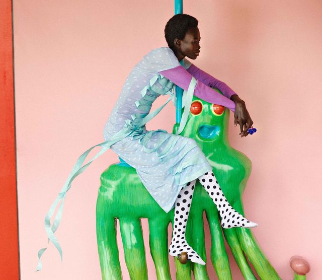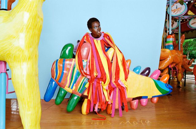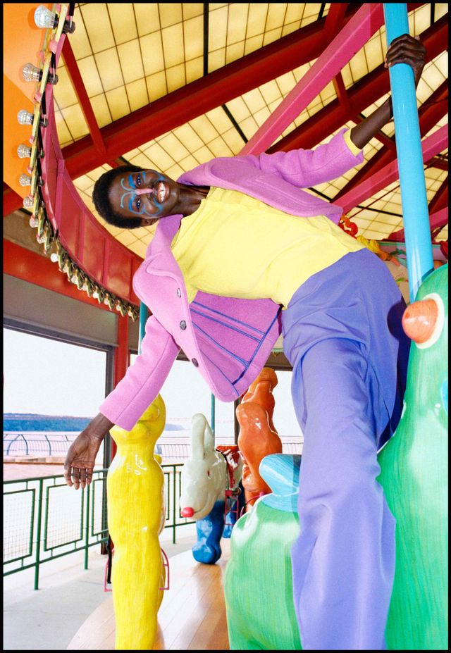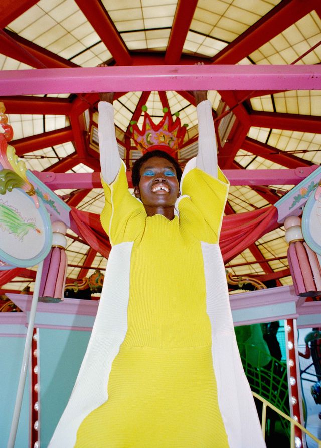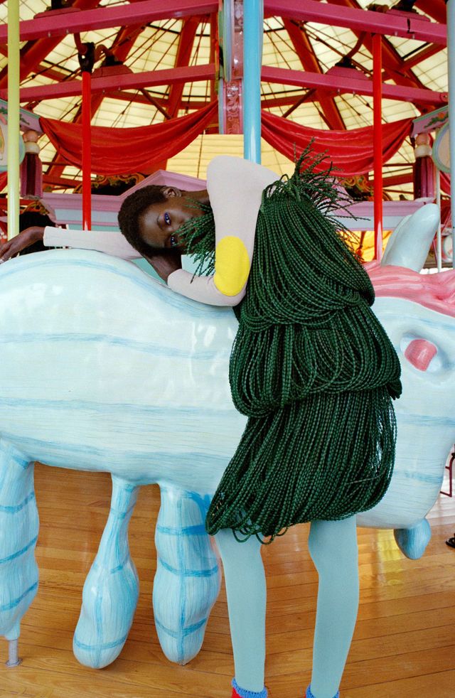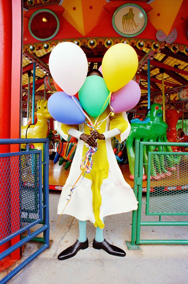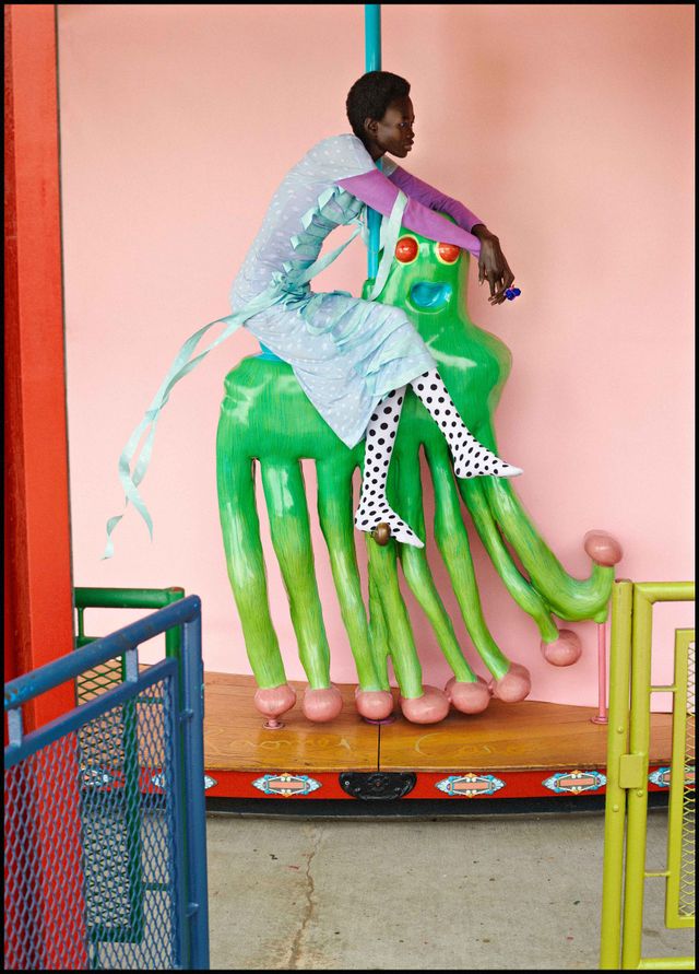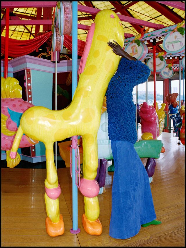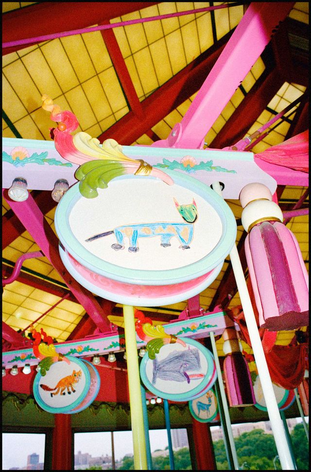 Die größte Freude beim Karussellfahren bereitet oft nicht das Fahren, sondern das Karussell selbst. Ganz besonders beim »Totally Kid Carousel« im Riverbank State Park in Manhattan ist das so. Statt gewöhnlicher Tiere stehen unter der Kuppel bunte Wesen mit lang gezogenen Gliedmaßen, verrutschten Gesichtszügen, zu vielen Beinen oder fehlenden Mäulern. Ein himmelblaues Reh, ein blassrosa Elefant, ein giftgrüner Oktopus. Kreiert haben sie Erst- und Zweitklässler der örtlichen Grundschulen. Mitte der Neunzigerjahre bat der Künstler Milo Mottola die Kinder, ihr Lieblingstier zu zeichnen. 36 Ideen wählte er aus und fertigte nach den Vorlagen die Karussellfiguren. Mottola achtete darauf, dass die Kreaturen oben eine gerade Fläche zum Sitzen hatten und keine scharfen Kanten. Ansonsten richtete er sich ganz nach der kindlichen Fantasie. Passend dazu wurde auch die Mode auf diesen Seiten ausgesucht: Sie sollte so bunt und verspielt sein wie die Tiere. Neben jeder Karussellfigur wurde einst die Unterschrift des Schöpfers oder der Schöpferin in den Holzboden graviert, über jeder hängt die Originalzeichnung. Als Dank erhielten die Kinder einen Sparbrief – und lebenslangen freien Eintritt. Mittlerweile kommen viele von ihnen mit ihren eigenen Kindern vorbei.