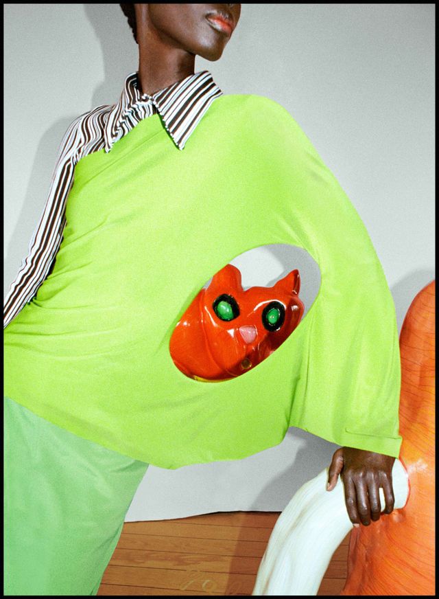 Pullover mit gelben Patches, von MARNI. Grünes Fransenkleid von LOEWE. Türkisfarbene Strumpfhose von FALKE.