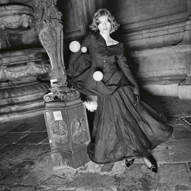 Kugelsicher: Bluse und Rock von Yohji Yamamoto. Schuhe und Handschuhe von Gucci. Socken von Falke.