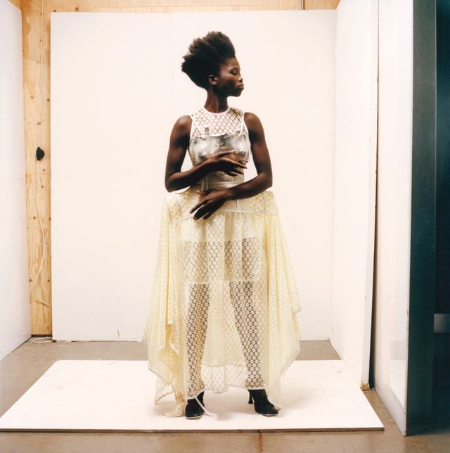 Das ist ein anderer sehr wichtiger Teil meiner Arbeit: Wie kann Frauenmode Männermode anregen? Die Fragilität und die Stärke der Frauen. Für mich spielt das Geschlecht eine untergeordnete Rolle. Aminat und Frankie zum Beispiel sind meine Freunde, sie modeln für mich, und wir entwickeln Ideen zusammen. Ihre Energie steckt in den Kleidern. Übrigens sitzt bei dem langen Kleid auf dem Foto Aminat auf Frankies Schultern.